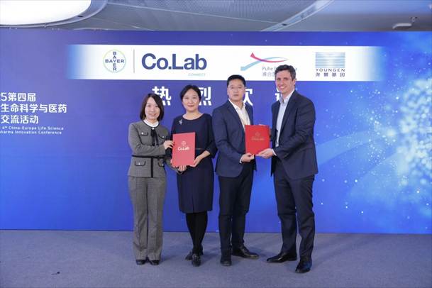 Welcoming the first batch of companies settled in Bayer Co. Lab: Alberto Nobili, Global Representative of Bayer Co. Lab (1st from right) and Yongqi Guo, CEO of Puhe BioPharma (2nd from right).